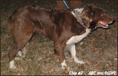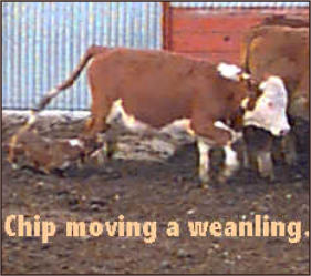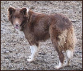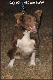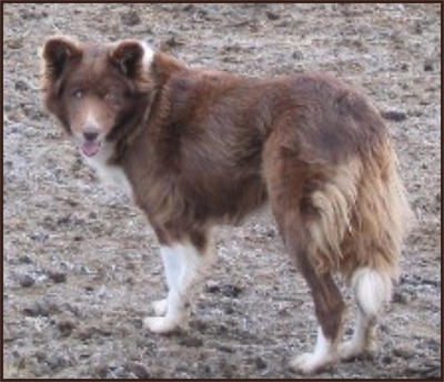 Chip was a sweetheart of a red Border Collie that weighs about 35 pounds. During her career as a stock dog for us, she had three healthy litters of pups. Several of her pups became working stock dogs, and a few went into agility. Unfortunately we did not keep one of her daughters back then, as we thought she'd have more litters, but Cancer changed that plan. Chip's mother was a small framed dog imported from Wale's and Chip took on her dainty features. Her dad, a big 60 pounds, once kept a cougar treed one night. Both parents of Chip's were red with white, and good working dogs from working bloodlines that are natural "heelers". Chip, even though dainty, had her fathers constitution and showed no fear of varmints that wonder into the yard nor around cattle. She was quick and could move troublesome cattle, even when she was at 13 years of age! One of her favorite jobs was filling the alley way with cattle for pour-on's, weighing, and shots. And whenever one of us went outside...we never walked alone, she was not only just a cowdog, she was a family dog. She lived a long life for a cowdog.
